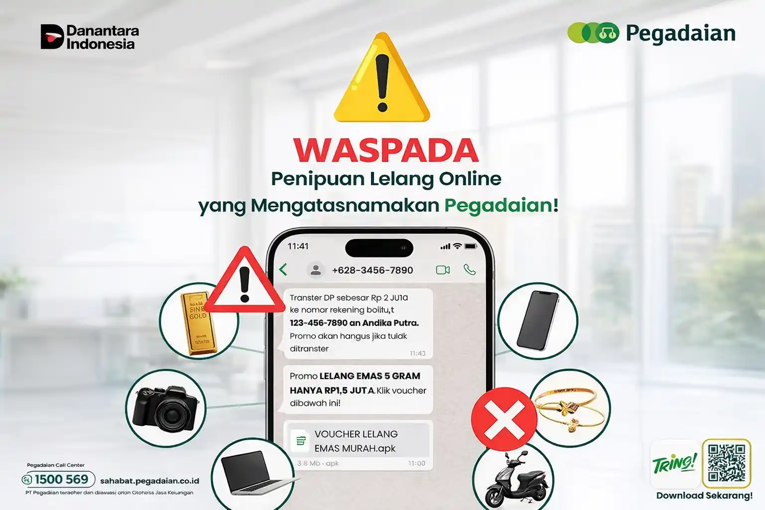 Pegadaian juga mengimbau masyarakat untuk lebih berhati-hati terhadap modus penawaran barang dengan harga sangat murah yang mengatasnamakan Pegadaian di internet. Penawaran semacam ini kerap digunakan pelaku kejahatan untuk menarik perhatian korban agar melakukan transfer dana atau memberikan data pribadi.