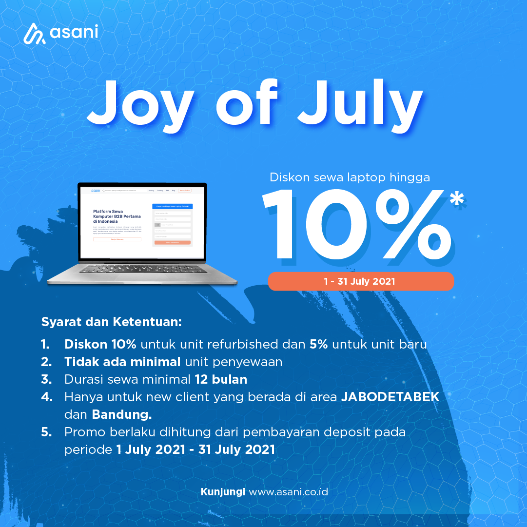 Layanan sewa laptop dari Asani dirancang untuk memenuhi kebutuhan berbagai sektor, baik bisnis, pendidikan, maupun pribadi. Dengan sistem yang terstruktur dan dukungan layanan pelanggan yang profesional, Asani membantu pengguna menghemat biaya pembelian perangkat dan memastikan kebutuhan teknologi tetap terpenuhi tanpa risiko kerusakan atau kehilangan aset. Promo Maret 2022 ini menjadi momen ideal bagi mereka yang ingin memperluas jumlah perangkat atau mencoba layanan Asani secara langsung.